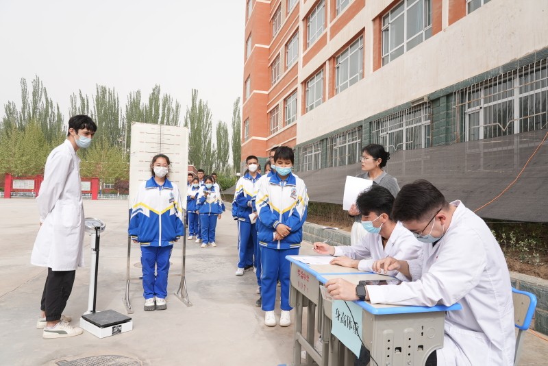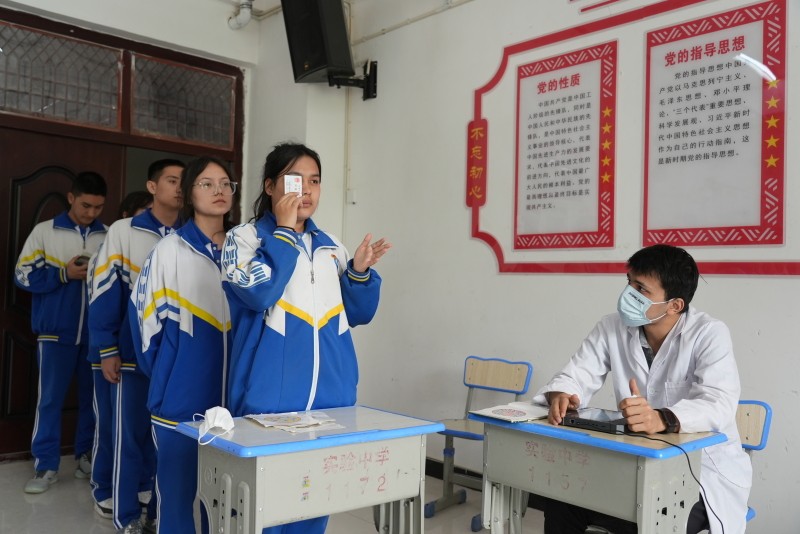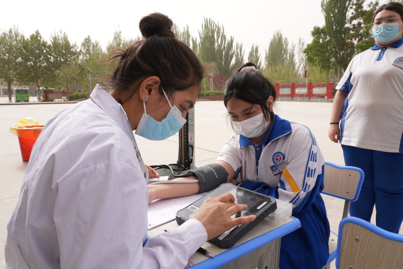 4月18日,在地区实验中学操场体检现场,学生们秩序井然,今年高考体检项目包括血压、身高、体重、视力、色觉、内科、外科、耳鼻喉科、眼科、口腔、胸部正位片、肝功能等。体检现场以“无纸化”体检贯穿整个体检过程,每位医生都配备有一台体检信息采集终端设备,考生只需通过刷身份证验证个人信息后,医生便能查看考生身份信息并进行检查。考生检查项目完成后,医生实时将体检结果录入平台,实现体检信息采集过程无纸化,并自动快捷出体检结论。所有体检项目在医护人员的耐心引导和同学们的积极配合下有序进行,考生最后只需刷身份证确认无漏检项目便完成体检。